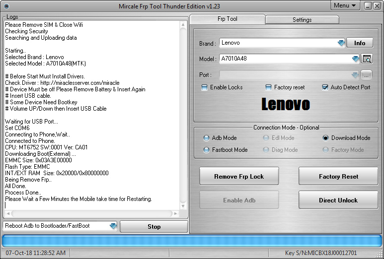 LENOVO K50A40 FRP REMOVED SUCCESS BY MIRACLE THUNDER FRP TOOL 1.23