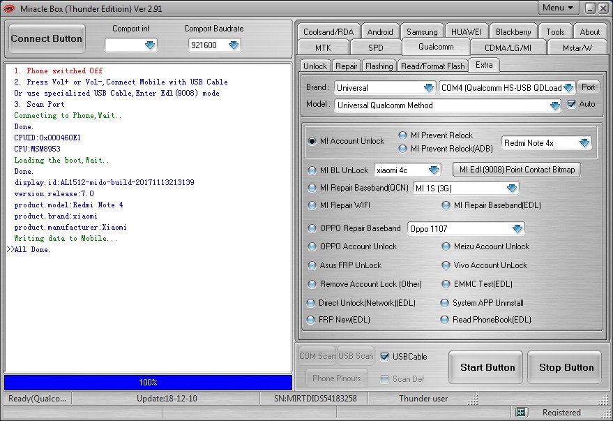 Mi Redmi Note 4X Mi Account Remove Done By Miracle Thunder Dongle