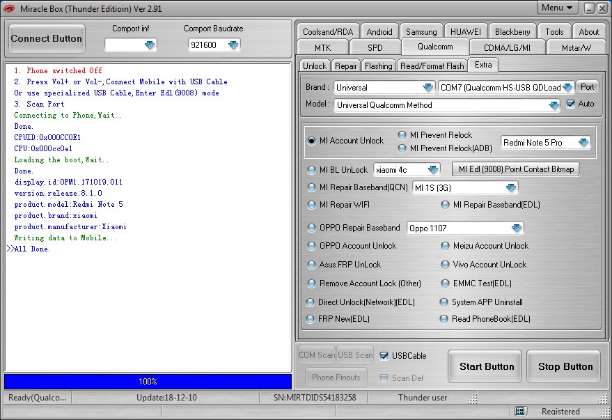 Mi Redmi Note 5 Pro Mi Account Remove Done By Miracle Thunder Dongle